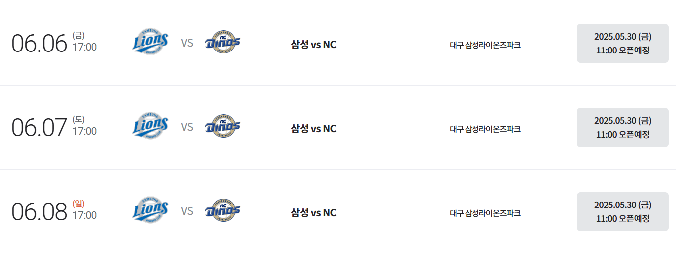 대구 삼성 라이온즈 파크는 수도권 구단 예매와 다르게, 3연전 시리즈가 한번에 다 열립니다.