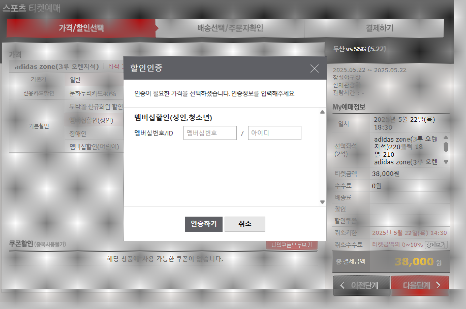 좌석 선택 후 예매창으로 넘어가면 예매 좌석수에 맞춰 멤버십할인과 일반석을 선택해줍니다.