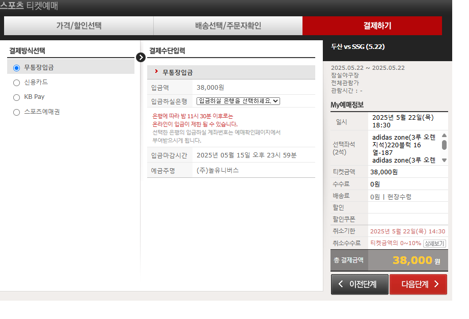 입금방식까지 선택하고 결제하면 자리 예매 완료!